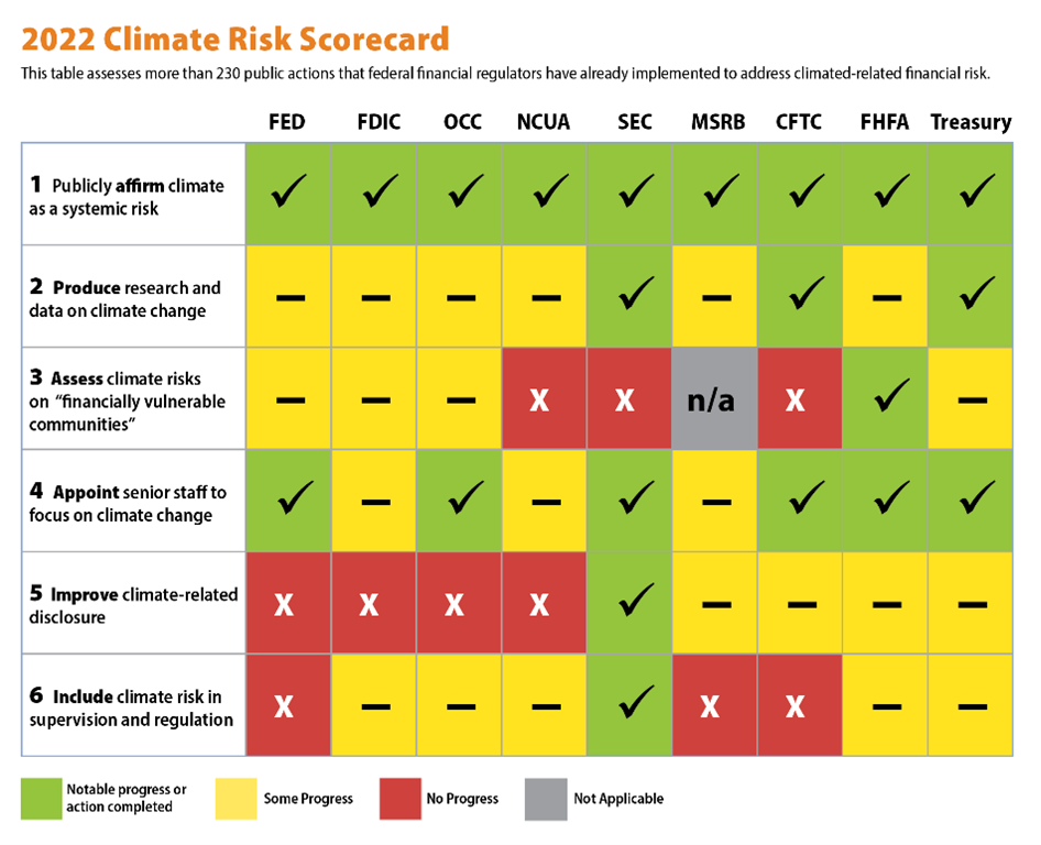 At the end of June, Ceres Accelerator for Sustainable Capital Markets released their 2022 Climate Risk Scorecard, which assesses actions from nine federal agencies as it relates to protecting and mitigating climate-related financial risks to capital markets and institutions.