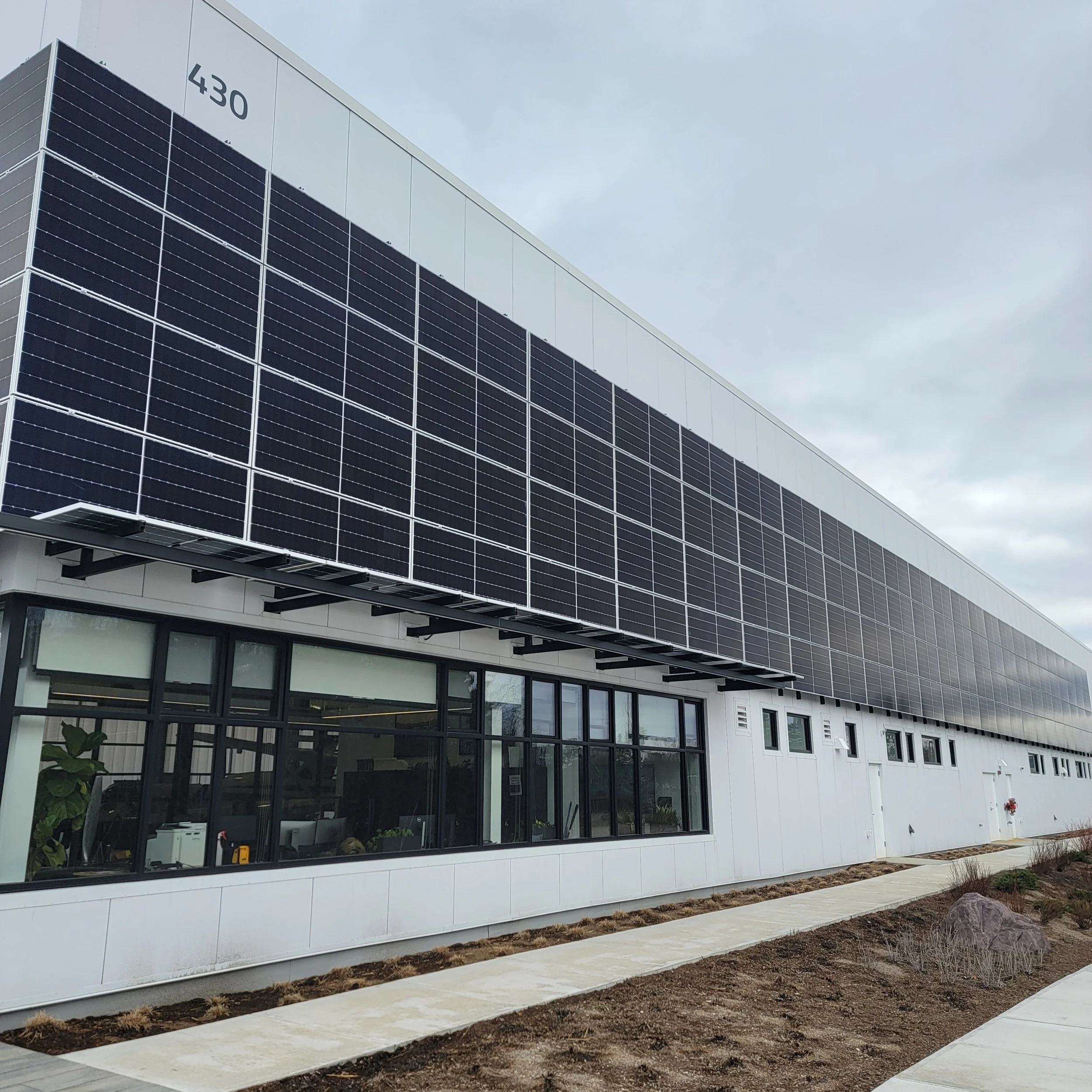 The project, developed in partnership with SunCommon, is located on Beta’s Maintenance & Training building, and includes a south-facing vertical array – a first for Sunwealth [see above].